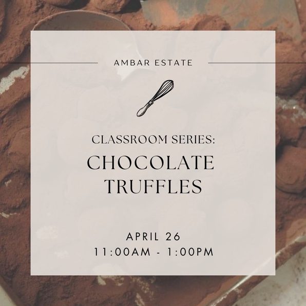 Join us for a hands-on chocolate truffle making class led by Chef Heidi. Guests will enjoy Ambar Estate wines and small bites while working with high-quality chocolate to create a selection of truffles, choosing from multiple fillings to customize each piece.